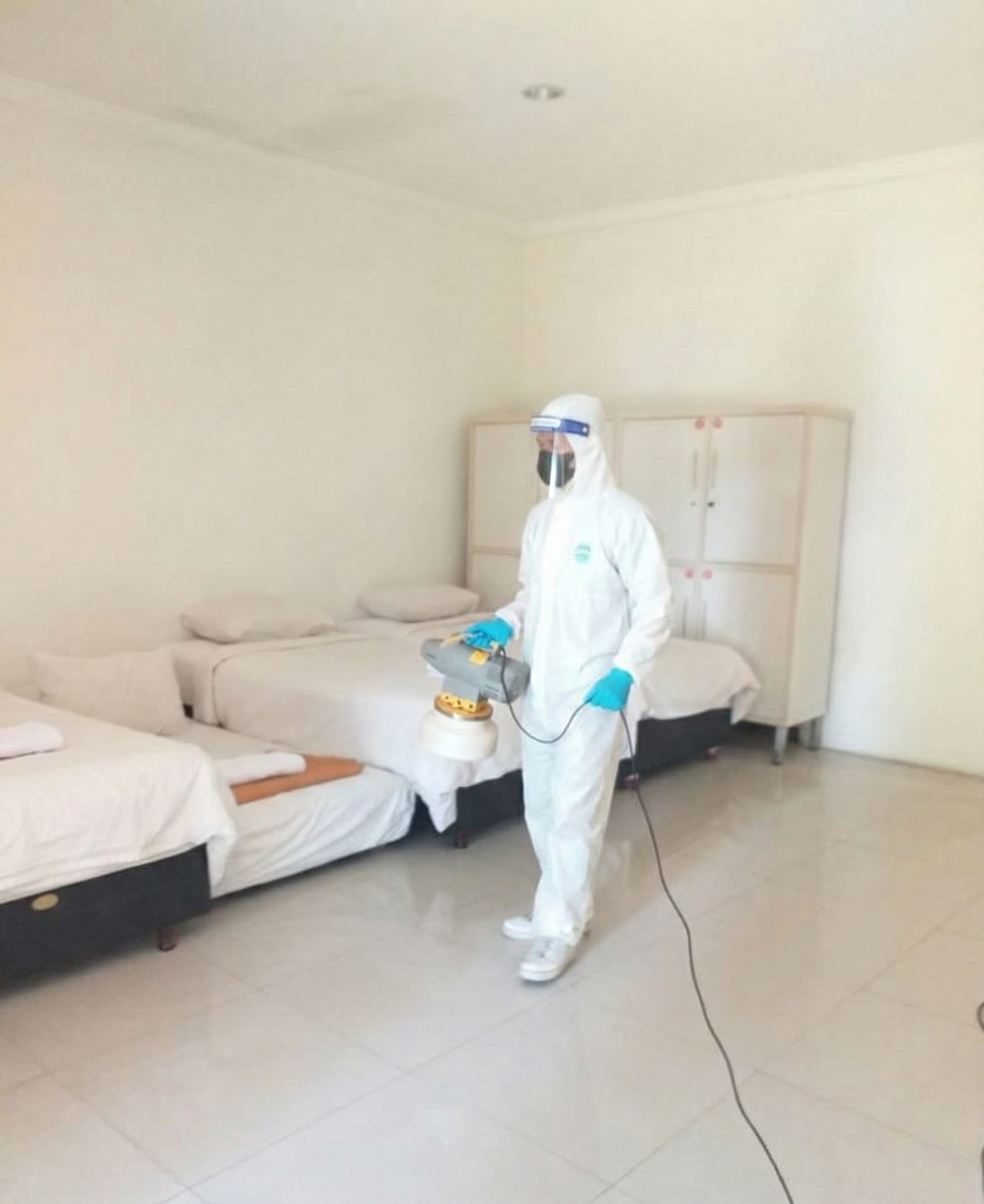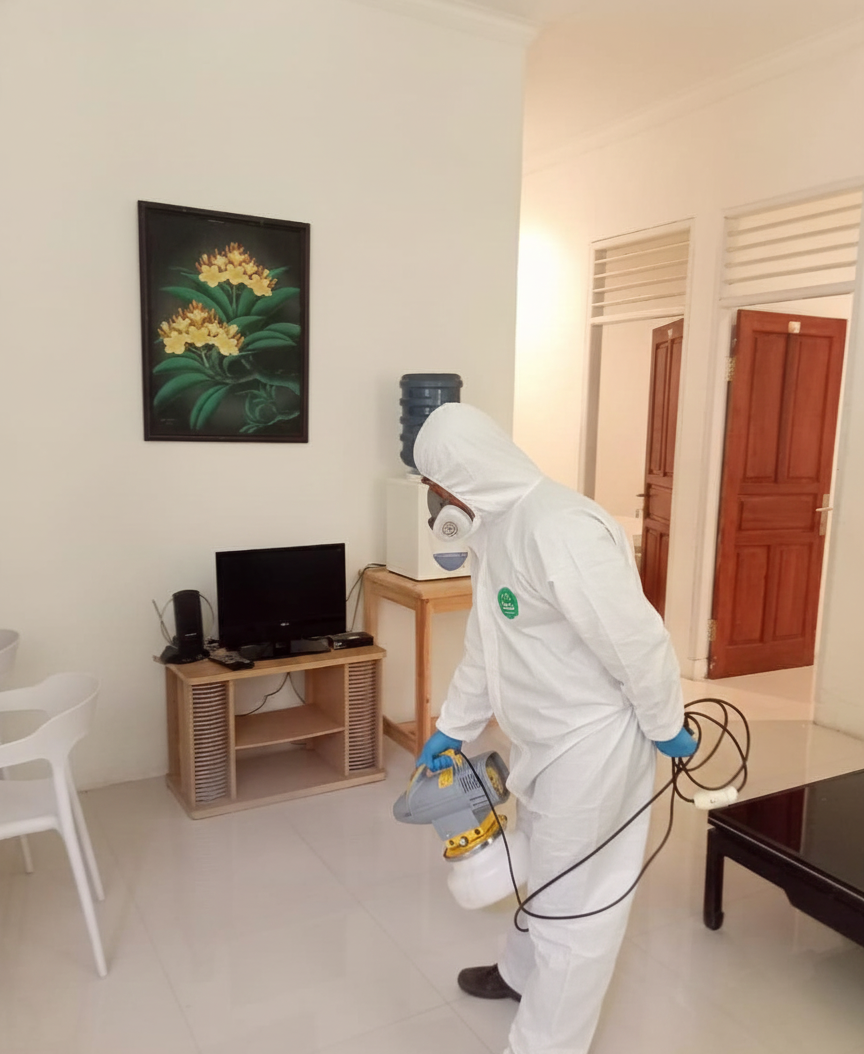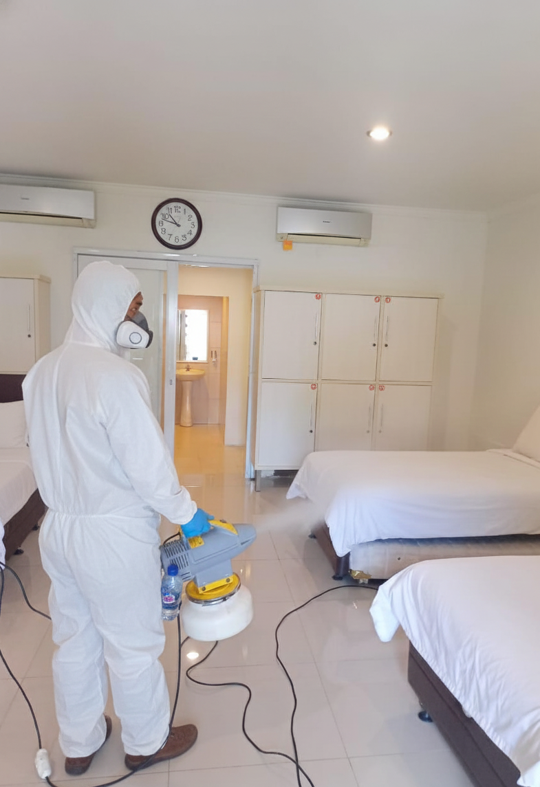 Proses desinfeksi dilakukan dengan metode menyeluruh menggunakan bahan bersertifikat dan alat berteknologi modern, sehingga efektif mensterilkan area yang telah digunakan kembali setelah jeda waktu tertentu dari potensi kontaminasi.